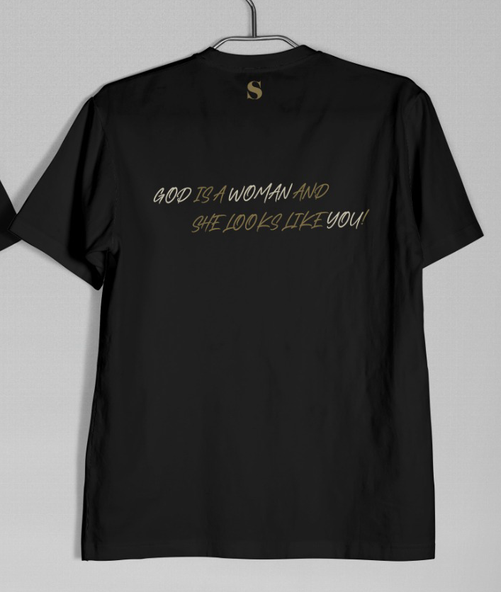 Black T-shirt with the cover of So Help Me God on the front and the lyric God is a woman, and she looks like you on the back . Looks good online, looks great in real life.